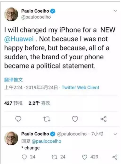 除了墨西哥人支持华为,巴西“国宝级”作家、著名预言奇幻小说家保罗·科埃略也表示支持华为。