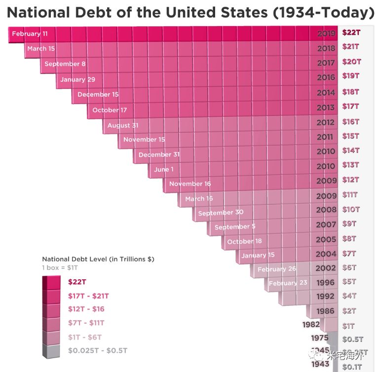 到2019年2月,美国债务已经达到了恐怖的22万亿美元。