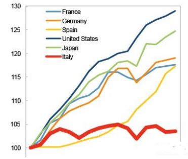 这是世界主要发达国家劳动生产力趋势图。可以看出,十年间,意大利的劳动生产力几乎是在原地踏步,而法德早已冲上天。如果把每个国家都看做一个大工厂,法国这个工厂在十年间的产品生产的速度和价值,提升了30%,德国提升了20%,而意大利,原地不动。