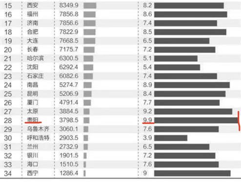 按增速来讲,贵阳在2018年GDP实际增速达到9.9%,位居全国省会城市第一名。而且1995年贵阳的GDP是117.71亿元,排名121名,而2018年的GDP是3798.5,全国排名62名,整体排名提升了59名,在中国所有城市中,排名仅次于提升了72名的合肥。