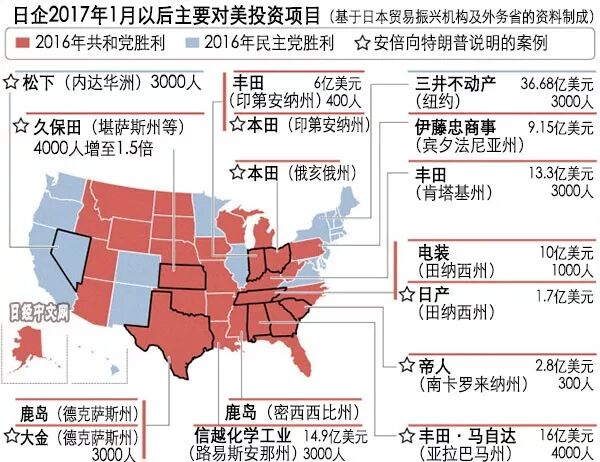 但特朗普这打算能不能落实,还得看日本企业家们愿不愿意。因为早在2016年特朗普当上总统以来,日本企业就对美国就进行了大量投资,特别是共和党占优势的“红色州”。