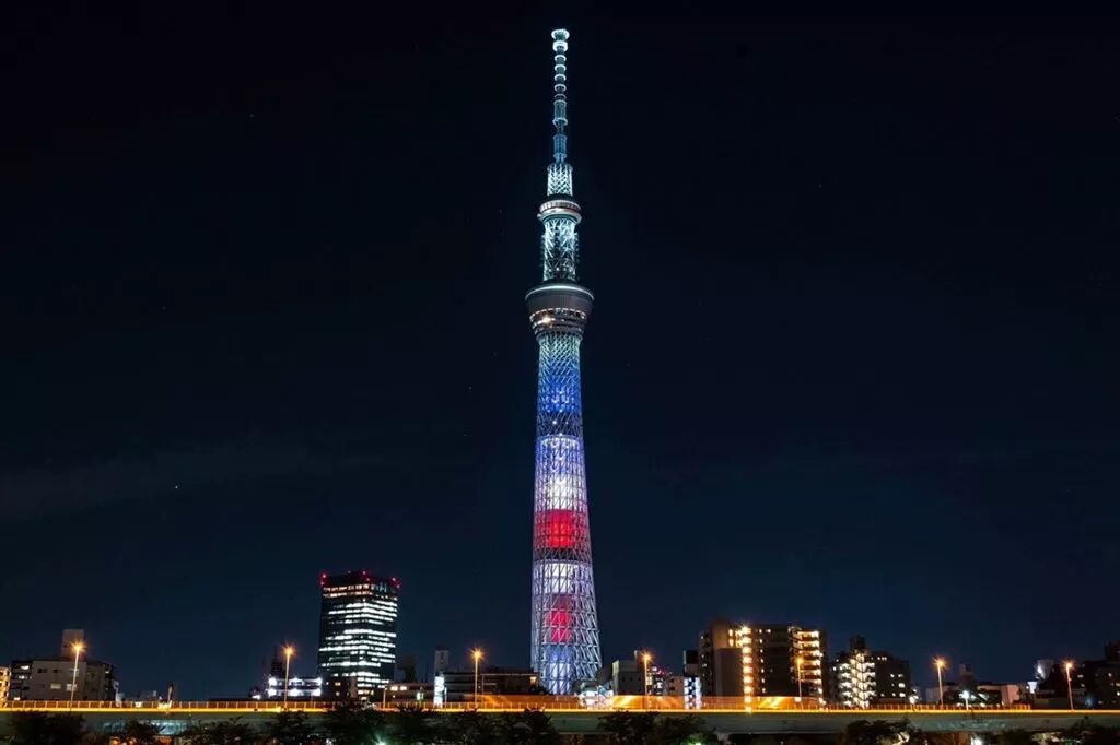 (东京天空树在特朗普访日之夜“染成”了星条旗的颜色)