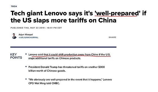 若事态升级,联想可以对其全球生产供应链进行调整。