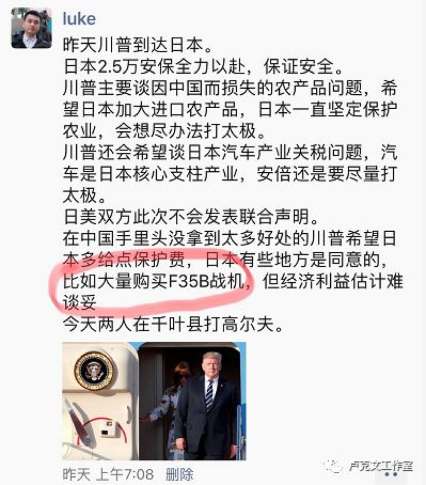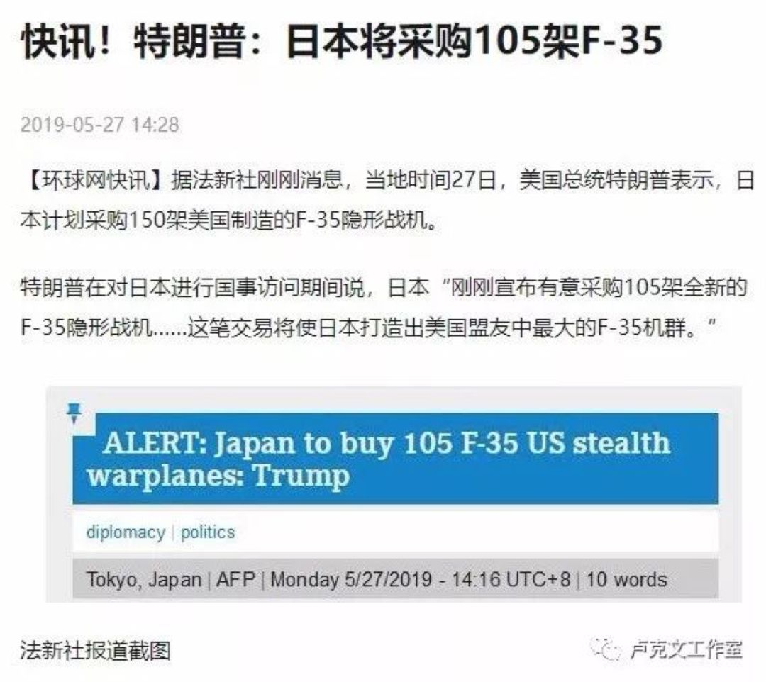 105架F35B是肯定谈得拢的,其实在2018年11月27日,日经亚洲就评论说将向美国已经定购了42架F35A的基础上再增购100架F35,这则新闻大多数人没留意,而我却专门记录了下来,因此2019年5月26在朋友圈说川普访日时日本会购买F35。