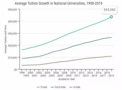除了住房问题,大学学费也是一笔大开销。美国的K-12教育阶段,因为实行的是义务教育,所以公立学校的费用基本上全免。但到了大学,形势就陡转直下了,管你是公立学校还是私立学校,收起学费时毫不手软。
