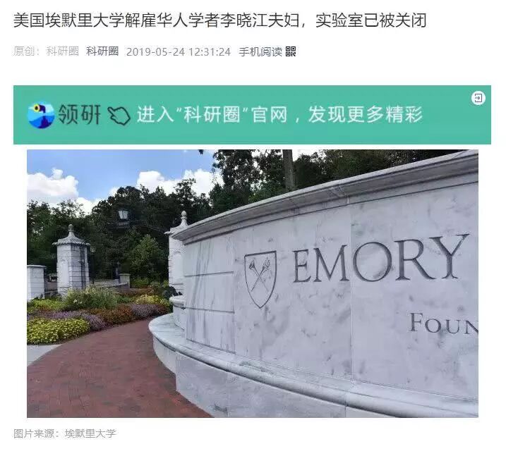 据媒体报道,埃默里大学对李晓江夫妇的行动非常突然,没有任何提前通知,实验室就被查封了,甚至有中国留学生还在做实验,结果发现实验室门禁和邮箱被锁死停用。