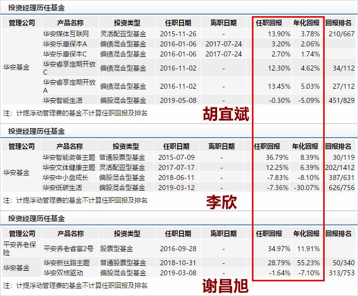 胡宜斌、李欣两位基金经理的代表作年化收益偏低,胡经理在3%~5%左右,李经理在6%~8%,谢昌旭经理的资料不多,无法分析。