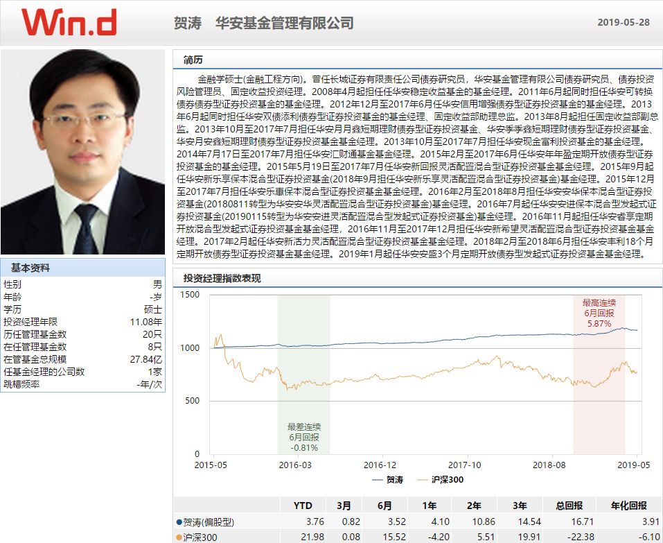 贺经理的投资年限已经有11年,代表作华安稳定收益从08年运作至今,年化回报6.25%,表现很不错,而郑经理目前投资年限还不足2年,资料并不多。