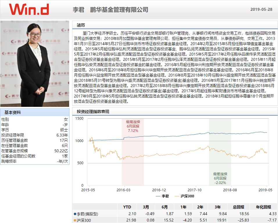 李君经理有6.33年的投资经验,目前有10只产品在管理,大部分产品的年化收益率在3%~4%,表现中规中矩。