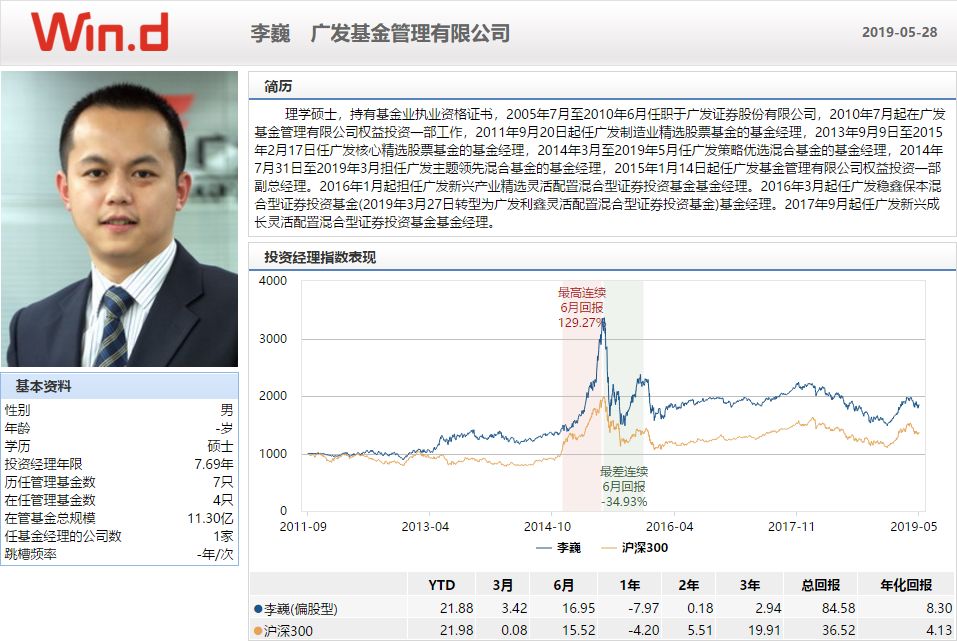 跟富国、鹏华对比而言,广发基金的人员配置简单很多,基金经理仅有李巍一位。