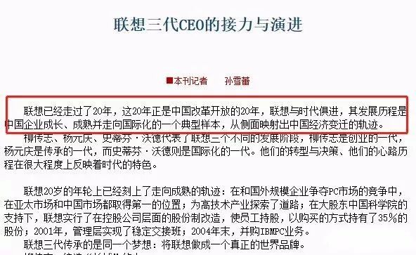 2005年,人民网放出了这样一篇报道——《联想三代CEO的接力与演进》。在文章中,联想的崛起,被视为中国企业的典型样本、中国经济的反映。