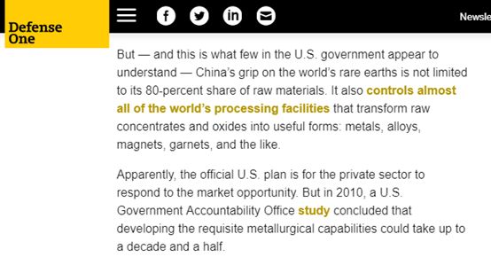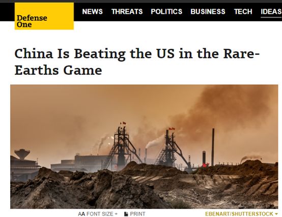 而一家名为“防务一号”(Defense One.com)的网站更是在去年就刊登了一篇宣称“中国正在稀土博弈上锤爆美国”的文章。