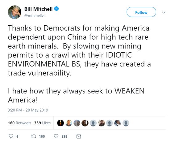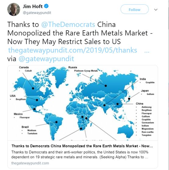 有意思的是一些美国保守的“爱国人士”对于稀土问题的看法,这些人一方面将美国如今在稀土上的被动都怪给了自己的同胞,称是美国之前的几届民主党政府对于环保和全球化的“偏执追求”,才导致美国将重要的稀土产业拱手让给了中国;
