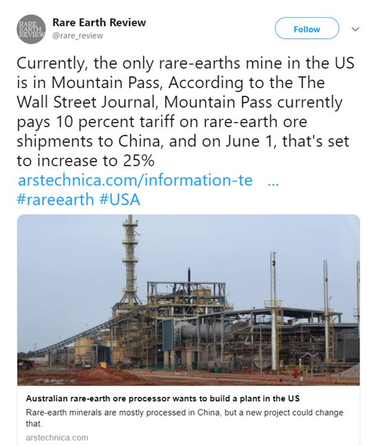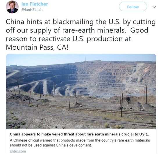 本文转载自微信公众号“环球时报”(ID:hqsbwx),原文首发于2019年5月29日,标题为《中方就稀土表态一出,美国各方反应来了》。