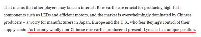 美国彭博社在今年3月的一篇报道中还透露,原来目前全世界只有澳大利亚的稀土生产商莱纳斯公司(Lynas),是完全没有任何中国资本参与的。