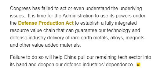 所以,这篇文章呼吁美国现政府直接通过美国1950年通过的《国防生产法案》,动用行政力量去直接推动美国建立完整的稀土开采加工链条,以免进一步加剧美国高科技企业对中国稀土的依赖。