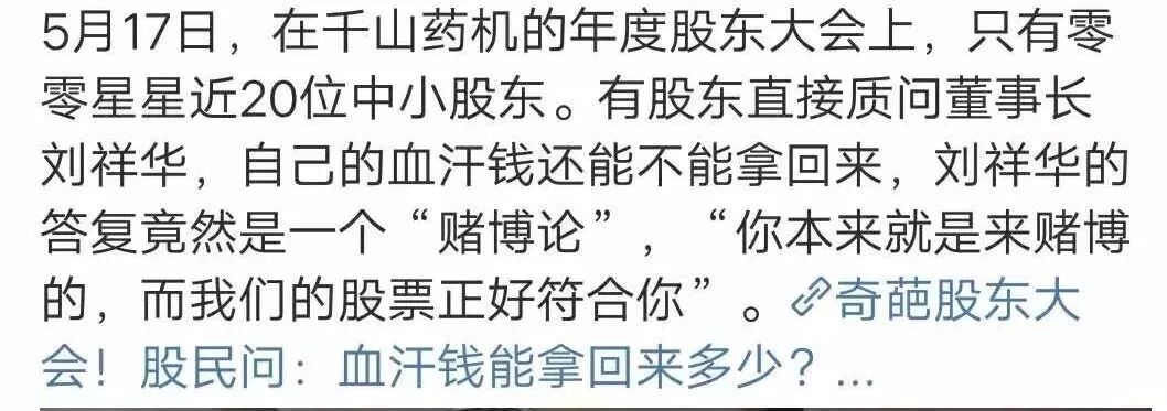 从这个意义上讲,千山药机董事长的那番话其实没错,在公司已经爆出极大负面消息后,还有人买进,你可不就是在赌博吗?愿赌服输,跑来问能不能拿回血汗钱,着实有点搞笑啊!