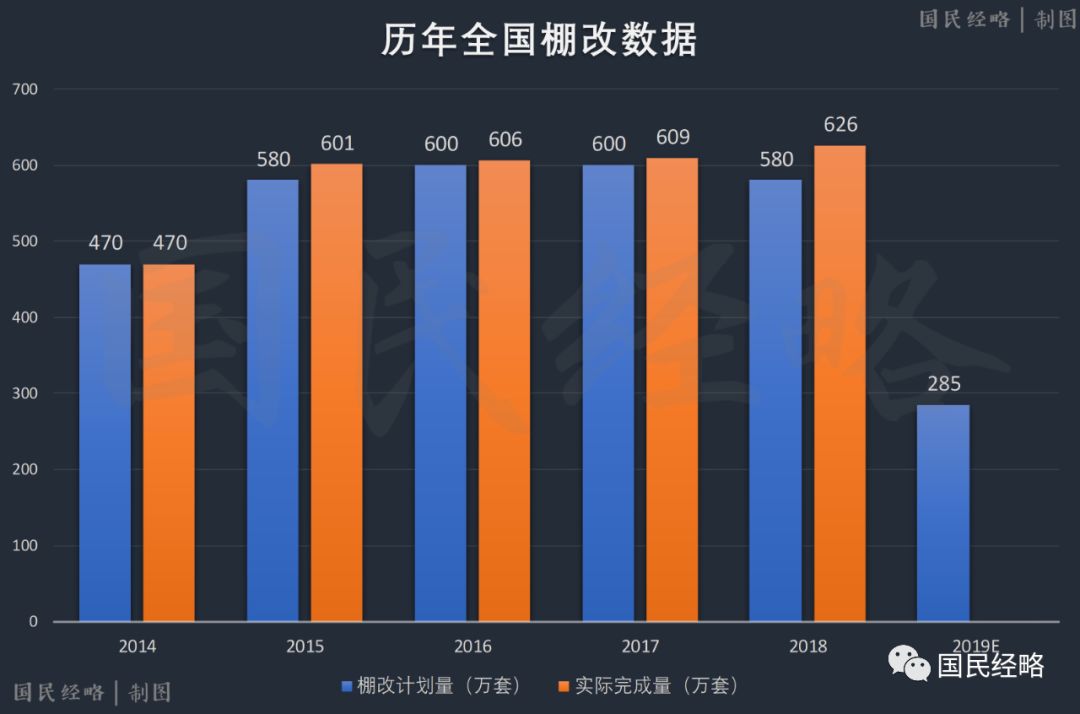 数据显示,2019全国棚改总规模仅为285万套,而去年实际开工量高达626万套,同比下滑54.5%。