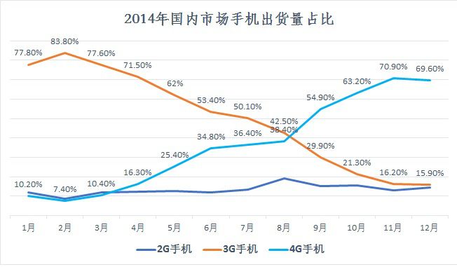 综上所述,5G手机很难在短时间内成为普及的电子消费品,其出货量可能是一个爬坡过程,参照下图所示4G牌照发放后2014年间的3G和4G手机出货量占比变化情况,可以预见在5G牌照发放后,从2019年下半年到2020年下半年的18个月区间内,4G手机销量的下滑与5G手机销量的爬升不是一蹴而就的,这期间众多手机厂商可能会倍感压力。