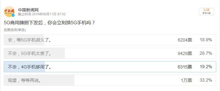 中国新闻网在社交媒体微博上发起了一个“5G商用牌照下发后,你会立刻换5G手机吗?的小调查,在截至目前3.2万人的投票选项中有33.2%的的用户选择“观望,等等再说”,另有48.9%的用户因为顾虑于5G手机价格高和5G应有场景不明确而投下反对票。这充分反映了普通民众接受5G确实需要一定的时间。
