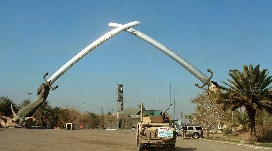 当时的萨达姆非常开心,他觉得自己胜了。时隔千年,伊拉克人又一次击败了波斯人,这是可以和卡迪西亚大捷相媲美的壮举。于是萨达姆大笔一挥拨了笔巨款,修建了卡迪西亚广场来纪念两伊战争的胜利,这座广场上最著名的建筑就是“军刀门”。