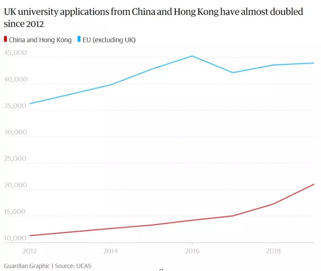 英国大学和学院招生服务中心(UCAS)的数据显示,2019年中国内地和香港学生本科申请人数从去年的17000人增加到21000人,增幅高达23.5%,英国留学上升趋势非常明显。而且,中国内地本就是英国国际学生来源最多的地方。