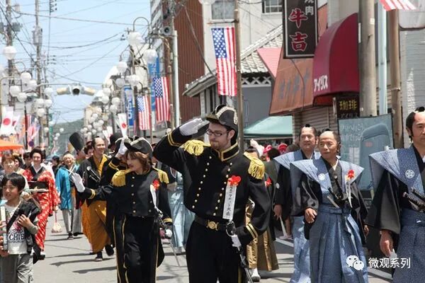 参加的人打扮成幕府武士和早期美国士兵的模样走在一起,以庆祝美国人来打开国门