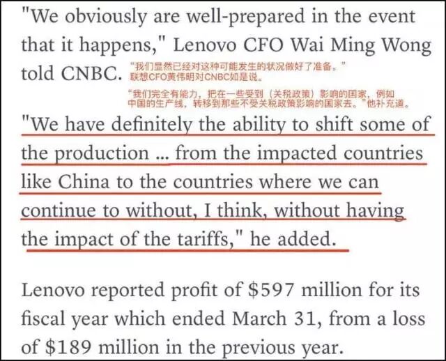5月24日,联想集团CFO黄伟明捅了更大的篓子,在回答CNBC记者提问时表示,联想已经做好了充分准备,绝对有能力将一些生产从受影响的国家转移到不受关税影响的国家,联想在世界各地都设有制造基地。