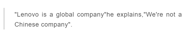 杨元庆的原话是:“联想不仅仅是中国公司,更是一家全球公司。联想的全球布局不仅在各大市场部署营销力量,我们在中国、美国、巴西和德国设计研发产品,我们在中国、美国、巴西和墨西哥生产制造这些产品。我们是一个真正意义上的全球公司。”