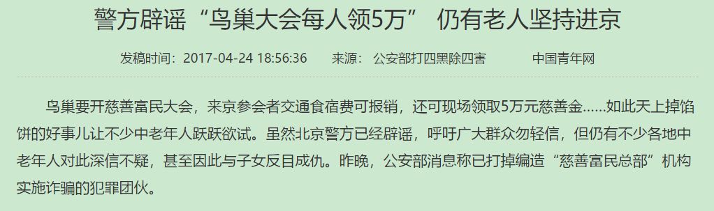 这个事被广西男子杨华兴听到了,他把自己包装成 “最高民族资产解冻委员会”成员,联系上了陈玉英,称只需要缴纳10元胸牌制作费,便可以前往鸟巢体育馆领取五万元。此刻正在热锅上的陈玉英将这个消息广而告之,结果交过钱的大批老人从全国各地都跑到鸟巢。那几天鸟巢周边到处是带着铺盖露天而坐的老人,问起来三缄其口,一时间让首都公安压力哭笑不得又压力倍增,中央电视台也在黄金时间花大篇幅解读这类骗局——但有人至今还是不信。