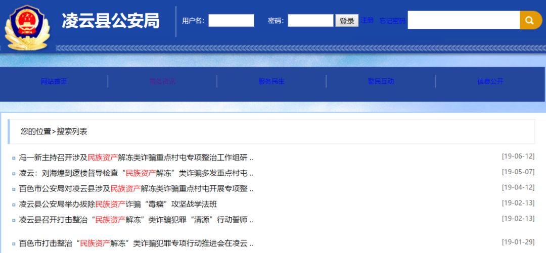 2019年1月15日,公安部召开新闻发布会,公安部刑侦局副局长陈士渠介绍,民族资产解冻类诈骗犯罪的幕后组织者主要来自广西凌云县。公安部已经要求凌云举全县之力,动员各部门和全社会力量推进各项打击和综合治理、源头治理工作,力争迅速改变此类案件多发的严峻局面。