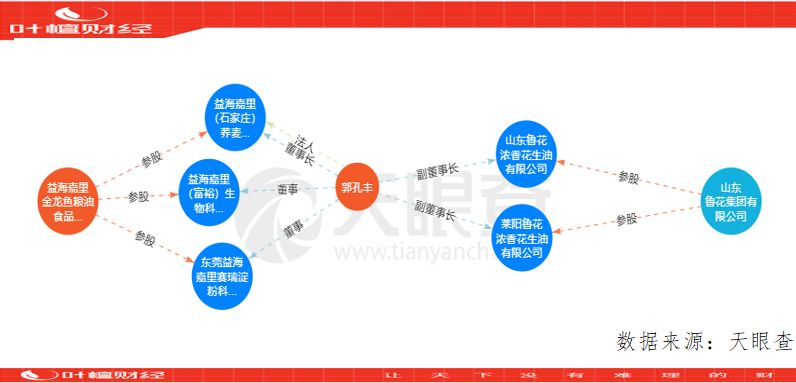 天眼查数据显示,金龙鱼的董事长郭孔丰还担任山东鲁花的两家参股公司山东鲁花浓香花生油有限公司、莱阳鲁花浓香花生油有限公司的副董事长。