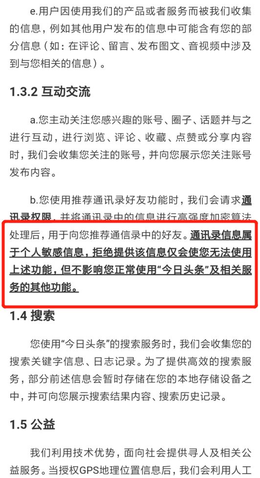 这段话挺奇怪的,因为头条自己的最新版本的用户隐私协议(2019年5月21日更新,2019年5月27日生效)中,对于用户通讯录信息是有明确界定的,头条认为通讯录属于个人敏感信息。