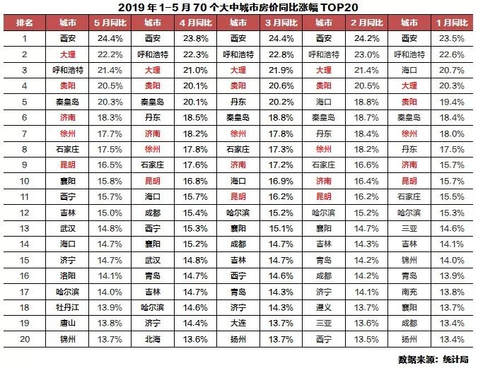 而且进入2019年以来,西安每个月都在以20%以上的同比涨幅排在第一位。