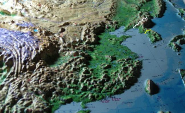 这是远东地区地形图,黄色线为三八线,白色线为中朝边界。