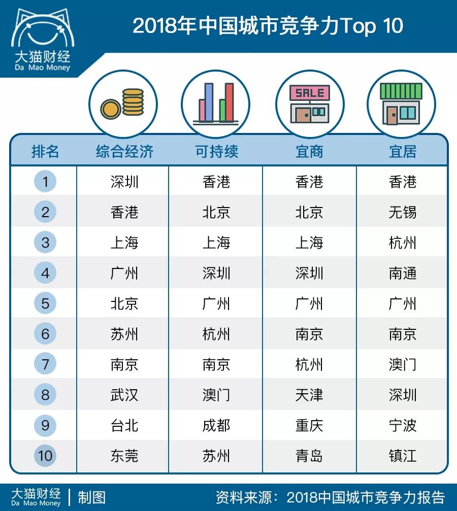 哪里更宜居呢?从宜居城市竞争力排行榜的top10来看的话,两个地方:长三角(无锡、杭州、南通、南京、宁波、镇江)和粤港澳大湾区(香港、广州、澳门、深圳),这些地方基本上同时也是中国宜商城市以及综合经济比较有竞争力的城市,城市建设也比较早且成熟,当然,房价也不低。