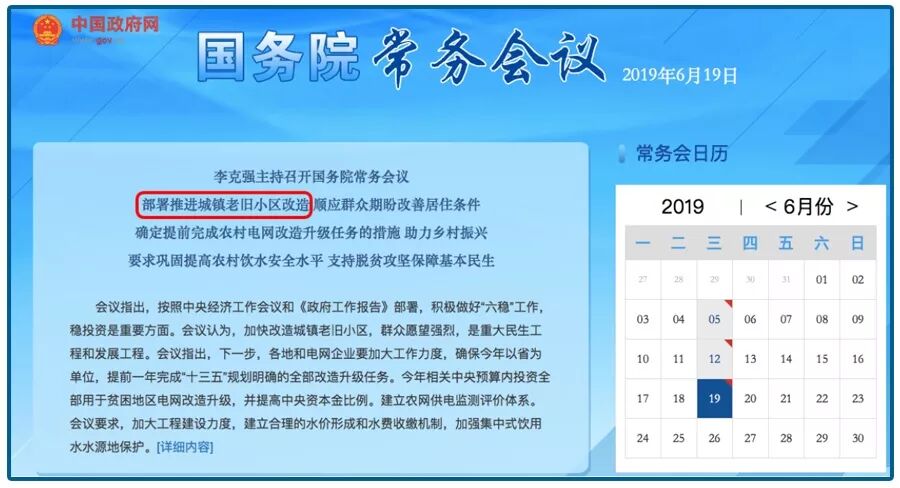 会议的重中之重,只有六个字“老旧小区改造”(旧改):“重点改造建设小区水电气路及光纤等配套设施,有条件的可加装电梯,配建停车设施”;“要在小区改造基础上,引导发展社区养老、托幼、医疗、助餐、保洁等服务”。