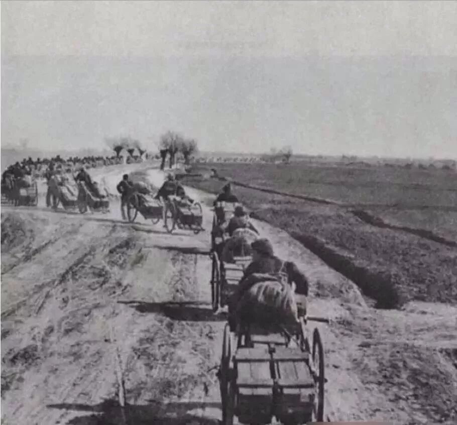 (图为淮海战役期间的支前民工队伍,土改后的翻身农民成了中共的坚定支持者)