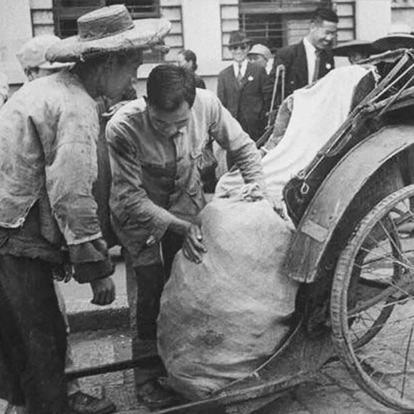 (图为由于金圆券飞速贬值,得用上麻袋装钱的国统区民众)