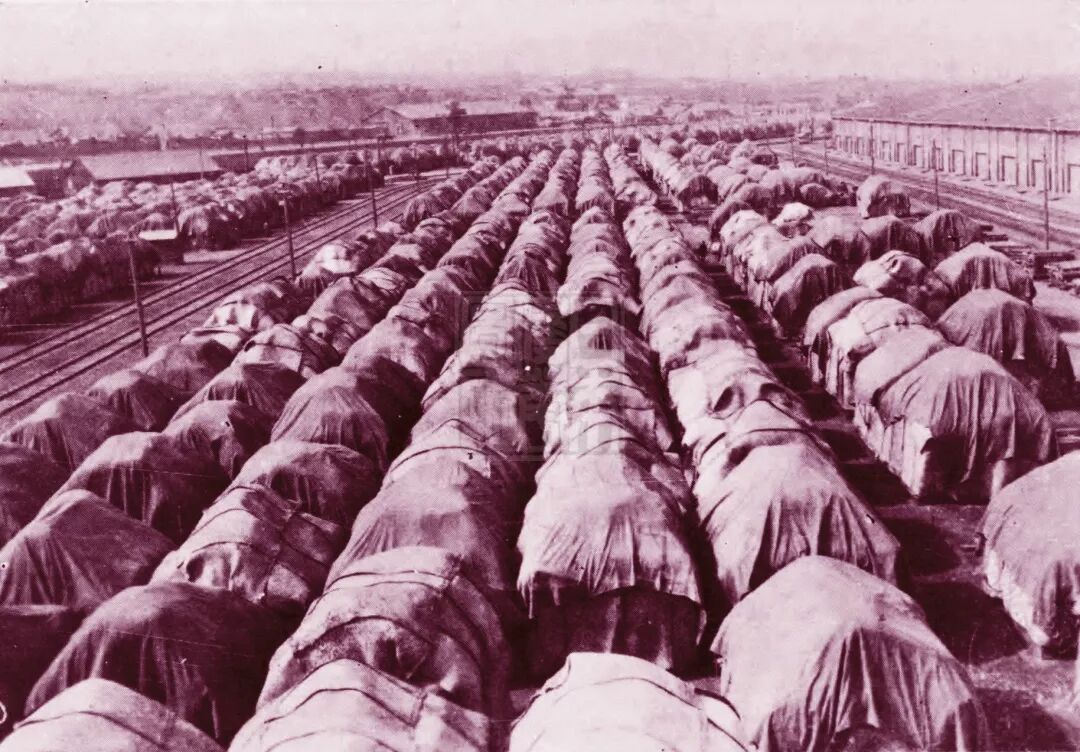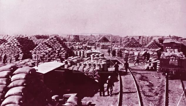(图为堆积在伪满新京火车站准备外运的粮食)