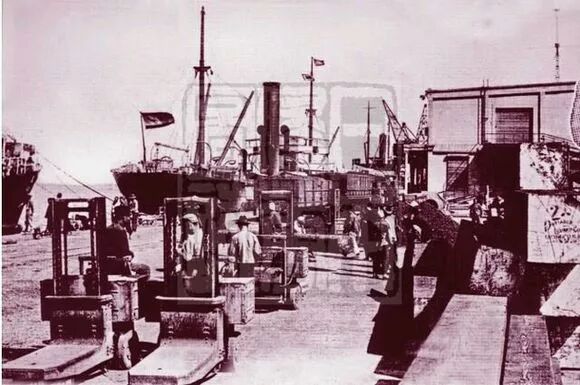 (图为日伪将掠夺的大量木材由大连港装船外运)