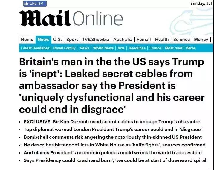 7月6日,英国《每日邮报》率先爆出了英国驻美大使达罗克的被泄密电(包括备忘录),因为其内容太过劲爆,迅速引发美媒们大肆跟风报道。这位尽职尽责的英国大使在密电中除了说特朗普不靠谱、不称职 和无能,还在秘密电报中警告英国政府说,特朗普的政治生涯可能是耻辱中结束,还形容白宫内部的斗争激烈到了就差“动刀子”了!这话说得,意思差不多就是特朗普是个黑社会头子,白宫就是黑社会。