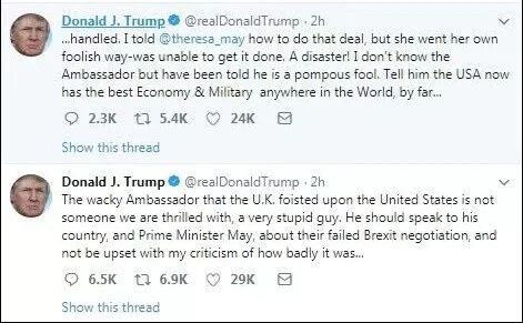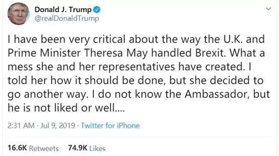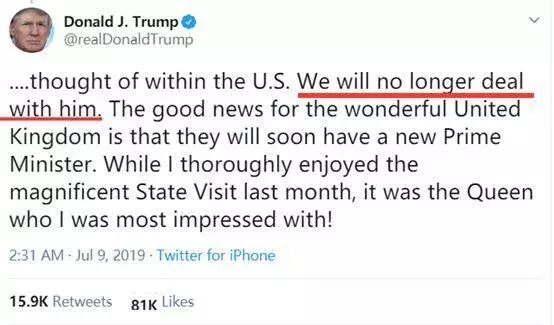 应该说,特朗普的第一条推特还是看在英美特殊关系上,给英国留了一些面子的,主要是希望英国方面换人,大事化小,小事化了。但是没想到英国这边如此不识趣,还真是硬杠上了,这样就彻底把特朗普惹毛了。特朗普当总统这两年的脾气,我们也都看到了,那是神挡杀神,佛挡杀佛,怼小英那是小菜!