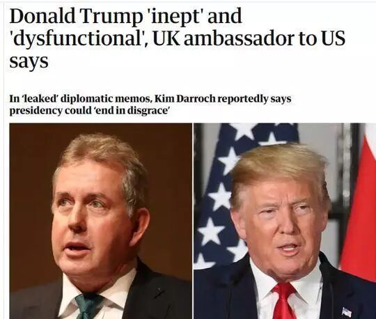 不过,报应来得真快,被中国打脸,肿还没消呢,英国驻美大使金·达罗克因为在给政府的密电中说特朗普是“不称职的”(inept)、“不靠谱的(insecure)”和“无能的(incompetent)”,还称特朗普的政治生涯已经处在崩溃边缘,并最终会“耻辱地结束”。这下可真是戳到了特朗普的痛处了,人家正在踌躇满志地竞选连任,你英国人居然来阴的,如此抹黑,一下子气得特朗普暴跳如雷,根据特朗普睚呲必报的性格,这下英国的后果真的很严重了!