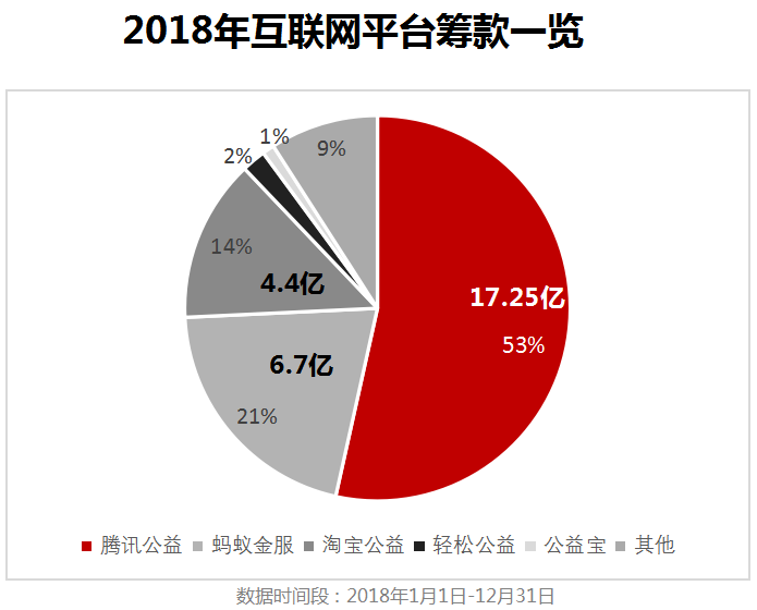 2018年,民政部指定的20家互联网募捐信息平台筹款总额超过31.7亿元。其中腾讯公益平台一家筹款17.25亿元,超过其他19家的总和