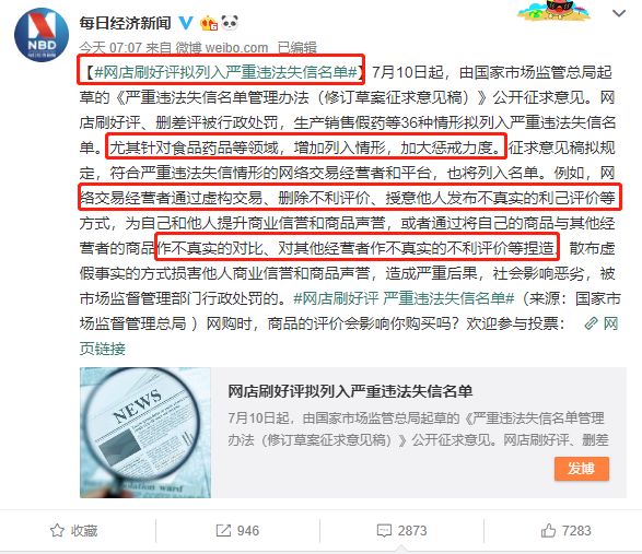 最近,国家市场监督管理总局起早了《严重违法失信名单管理办法》,其中把网店刷好评、删差评行为恶劣者也纳入了失信名单,尤其针对食品药品等领域,加大了惩罚力度,没想到这条规定引起了网络热议。
