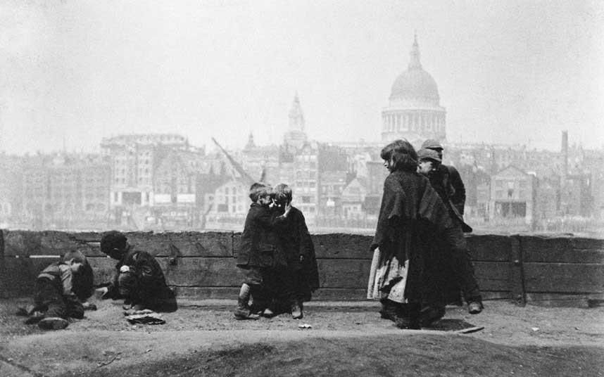 (图为19世纪,孩子们在泰晤士河Southwark岸上玩耍,这里因肮脏的生活条件而被外界熟知)