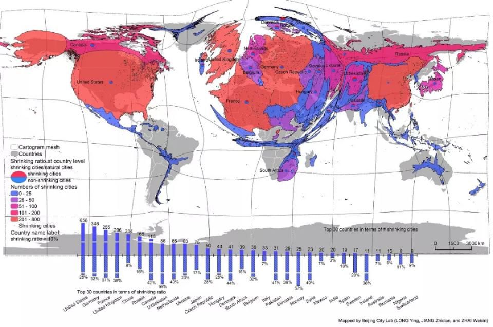 2000-2012年的数据显示,全球有20%属于收缩城市(从下图可以看出哪些国家收缩比较多,收缩城市越多,在分布图上看这个国家越大)。收缩城市数量最多的是美国,第二是德国,然后是法国、英国,中国排第五。