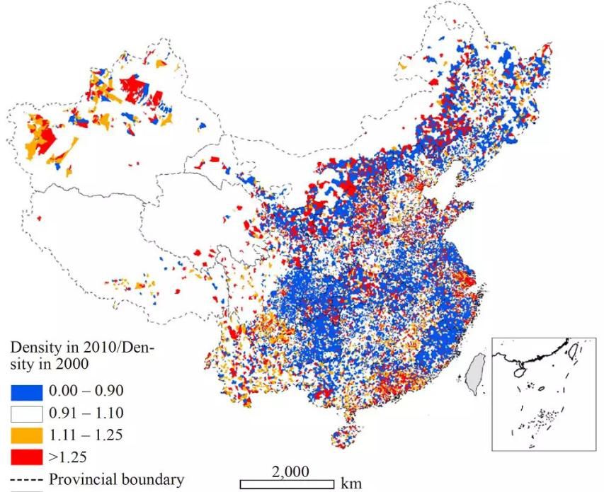 (图为2000-2010年中国城市人口密度的变化)