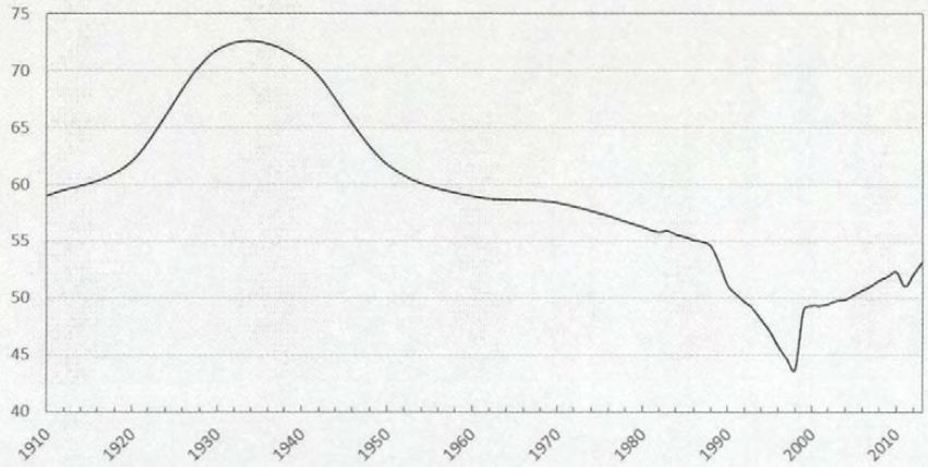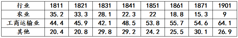 (图为1801-1901年间英国各行业劳动力结构<单位:%>